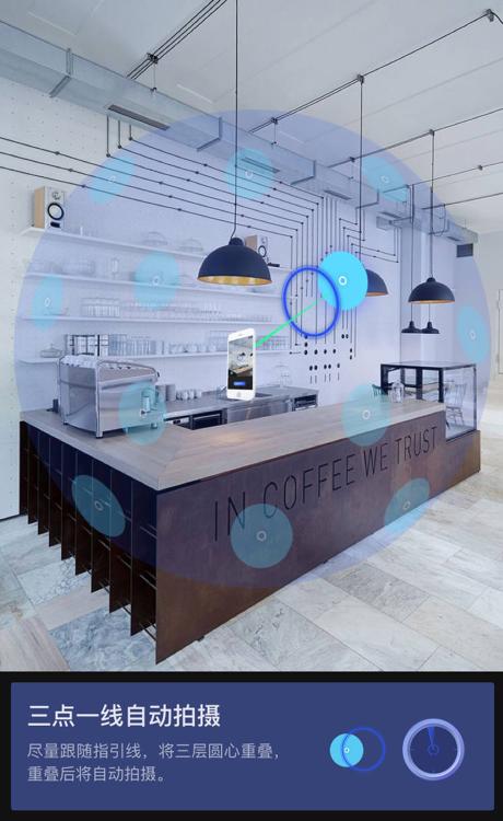 進(jìn)入如視VR APP的操作界面,用戶可根據(jù)自身需求,在操作界面自行選擇一個(gè)合適的定位進(jìn)行拍攝。根據(jù)這一定位,如視以AR輔助,引導(dǎo)用戶通過(guò)三點(diǎn)一線的“瞄準(zhǔn)層”進(jìn)行24個(gè)點(diǎn)位的固定畫(huà)面采集。用戶僅需保持相機(jī)位置不變,調(diào)整角度,即可快速完成畫(huà)面采集,整個(gè)過(guò)程不超過(guò)2分鐘。